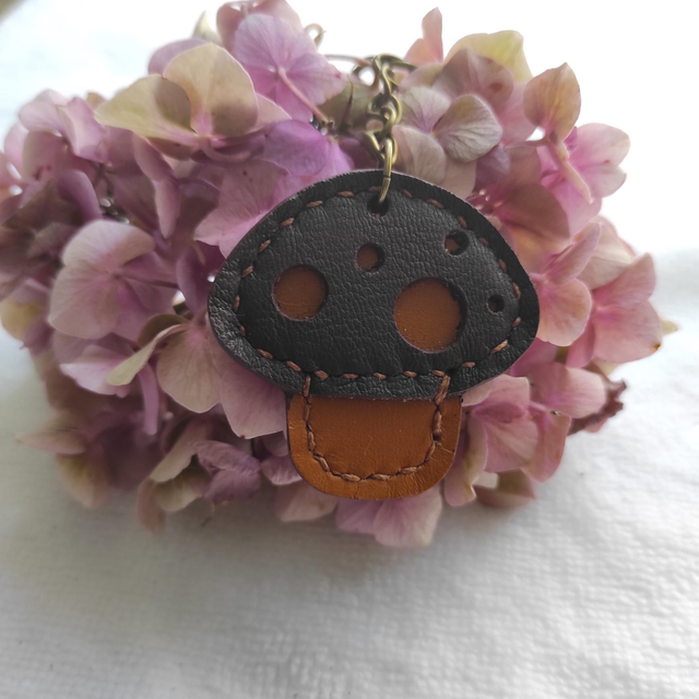 Porte clés champignon en cuir camel et chocolat. Cousu main au point de sellier. Tranches du cuir teintées. Le champignon mesure au maximum 4.5*4.5 cm environ. Hauteur totale du porte clés : 9cm environ.