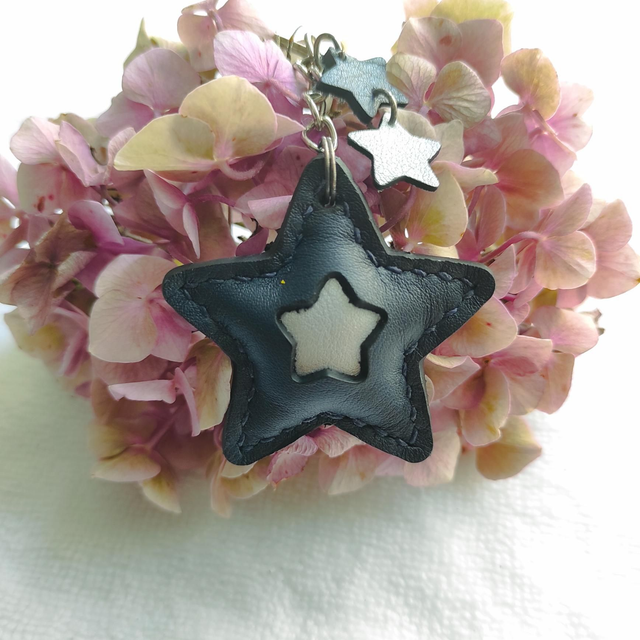 Porte clés champignon en cuir bleu marine et argenté. Cousu main au point de sellier. Tranches du cuir teintées. L'étoile mesure 4.5*5cm environ. Elle est agrémentée de petites étoiles coordonnées et montées sur un anneau brisé couleur laiton.