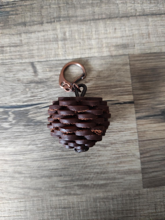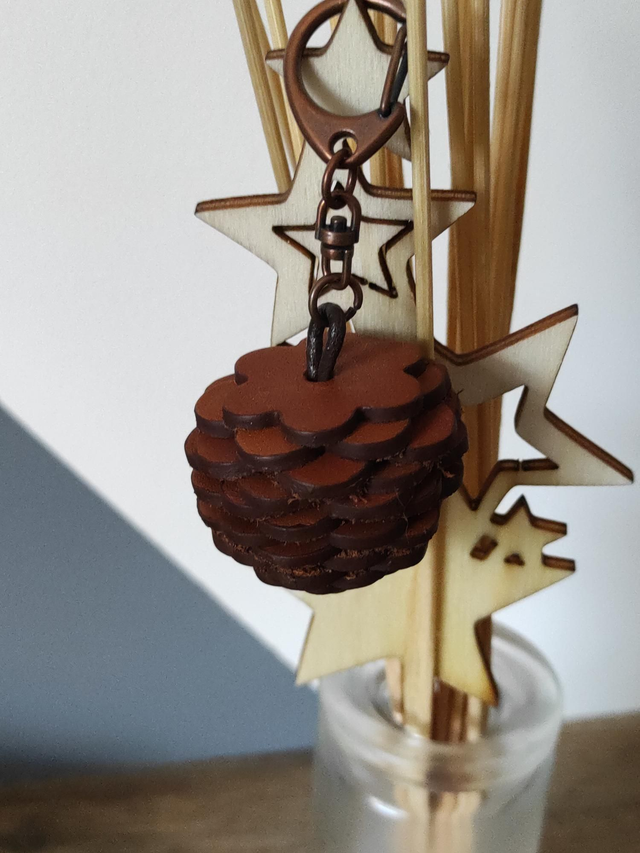 Porte clés pomme de pin composé de fleurs en cuir encollées et montées sur un cordon en cuir coordonné.