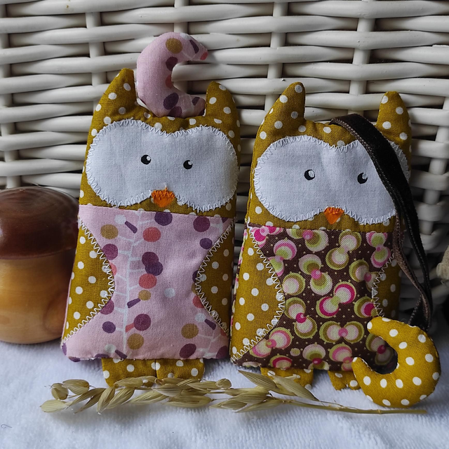 Range clés hibou. Cousu machine, tissu coton et doublé d'un molleton. Anneau brisé, attache en ruban assorti. ll mesure 11x8 cm environ. Ouverture en bas de 6cm environ. Patron réalisé par mes soins. Tirez sur la petite lune et vos clés sont à l'abri dans votre trousseau!