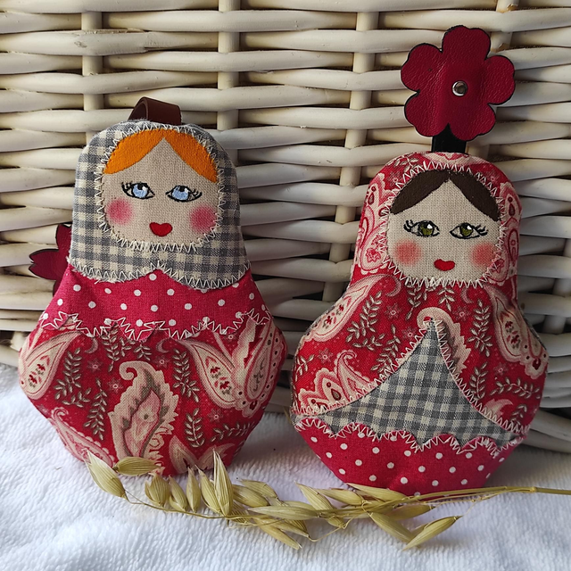 Cousu machine, tissu coton et doublé d'un molleton. Anneau brisé, attache en cuir rehaussée d'une petite fleur doublée et rivetée.